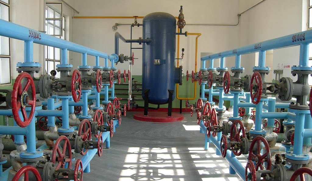 Traditional skid room with pipelines and manual valves: